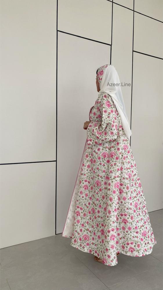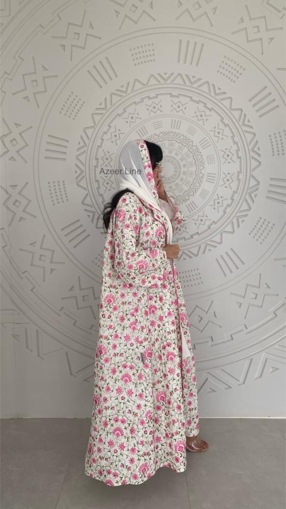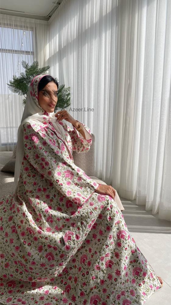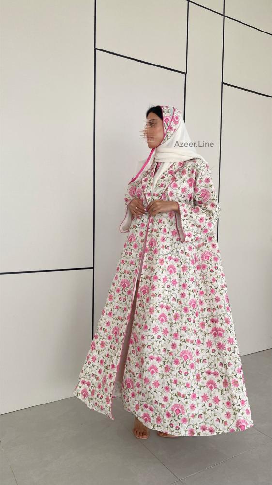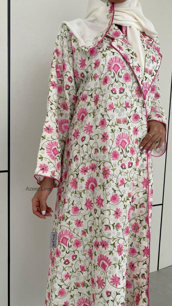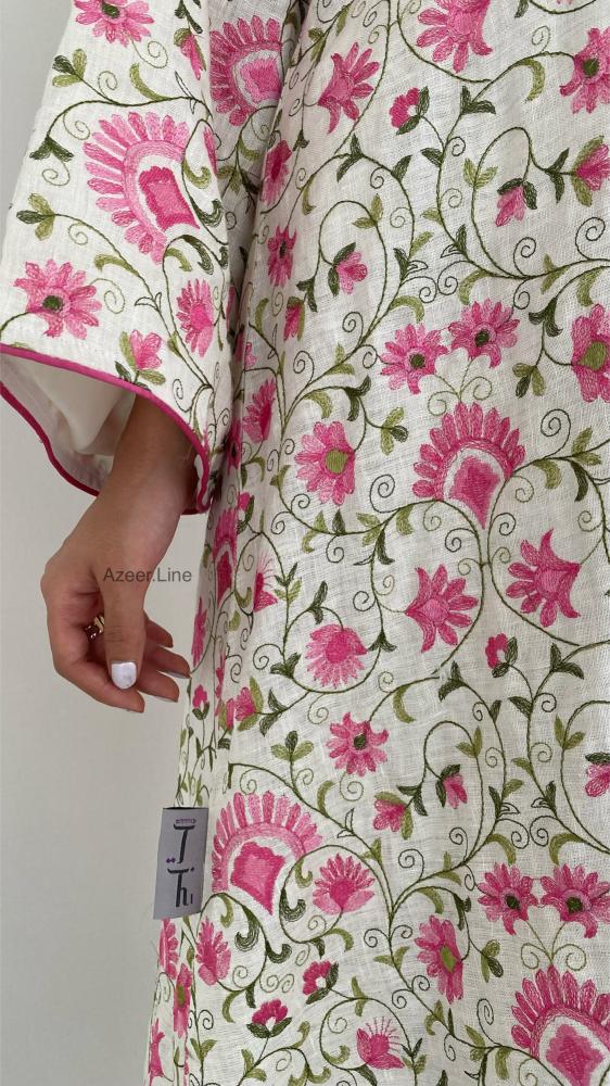 عباية لينن هندي مطرزة بالكامل مع اطراف قيطان فوشي
