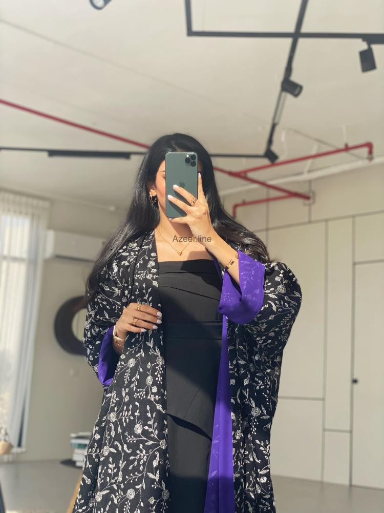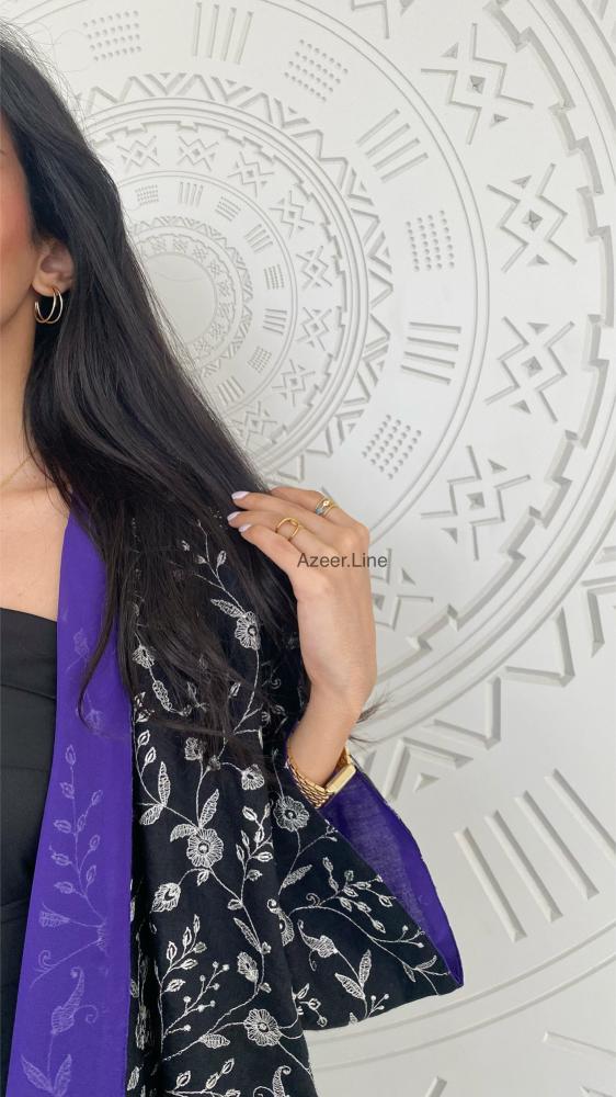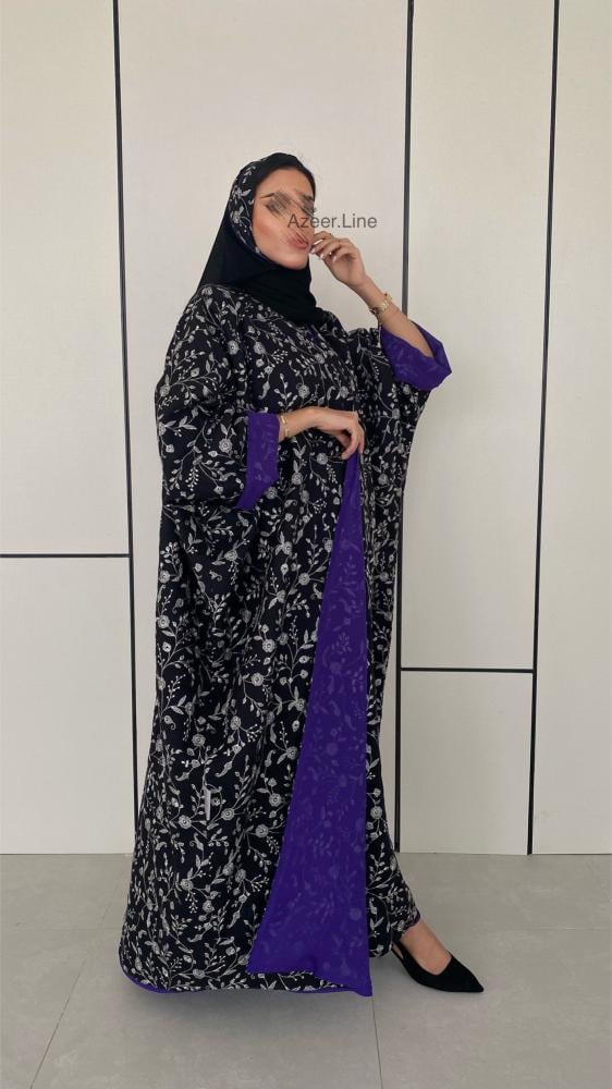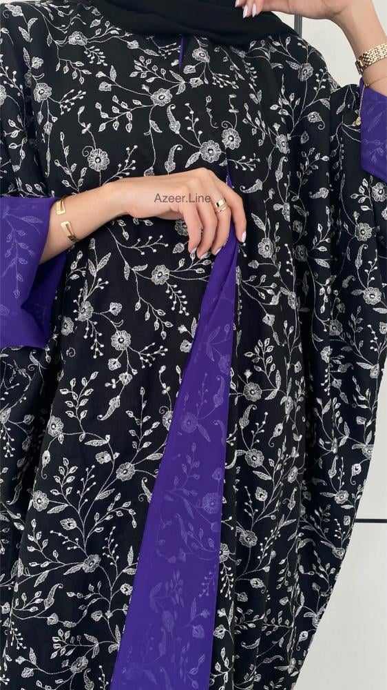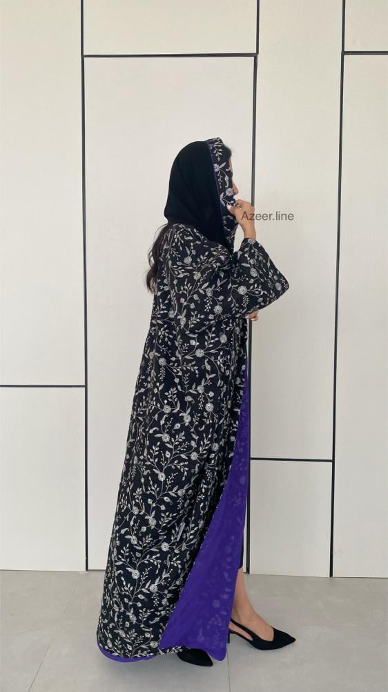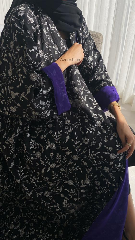 عباية لينن هندي مطرز فضي مبطنة جورجيت بنفسجي
