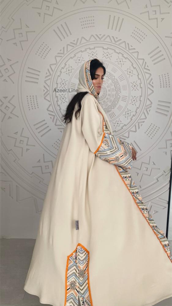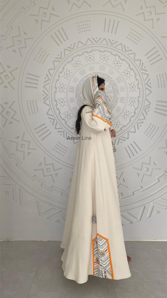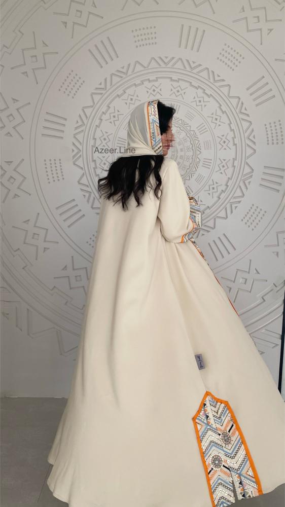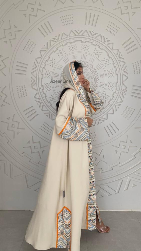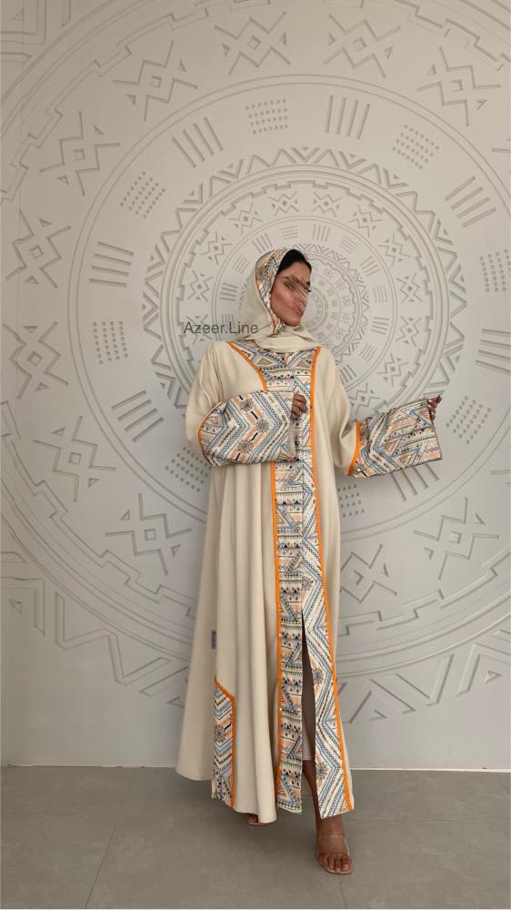 عباية قماش باربي لون سكري مع لينن هندي مطرز
